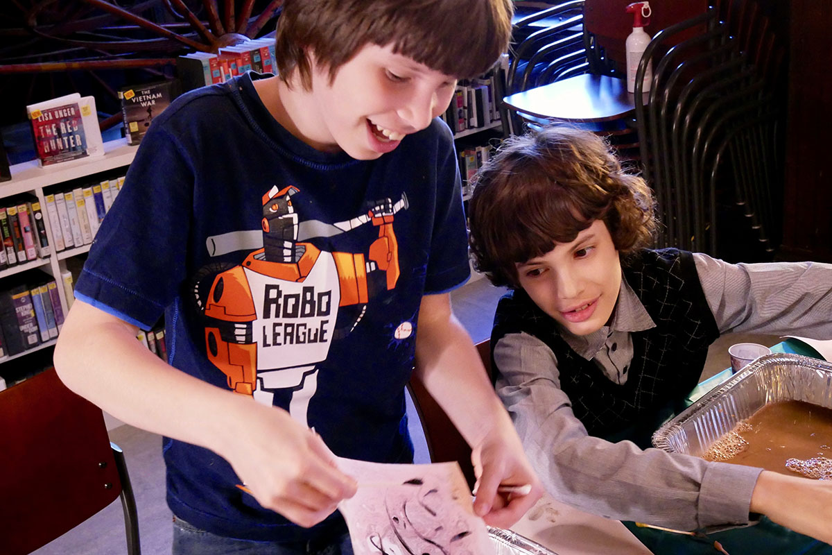 Bard students teach kids how to make marble milk paper using soap and food coloring, and learn about how calcium affects saturation rates.